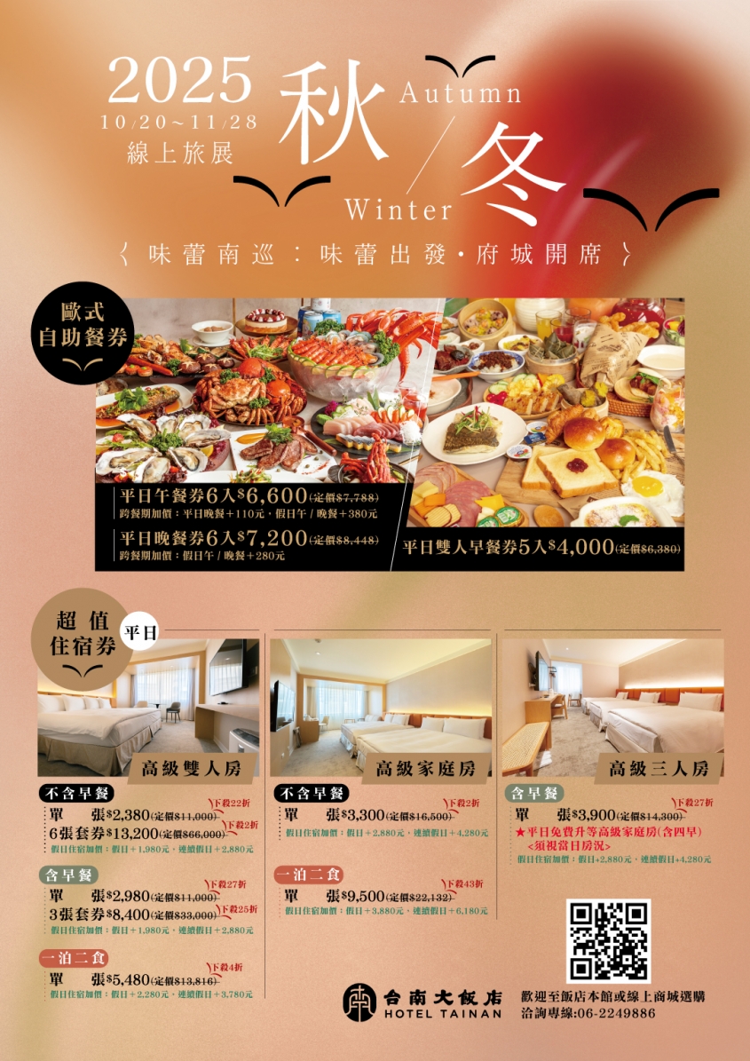 住宿票券06-2289101、歐式自助餐券06-2249886 ➜立即線上購券